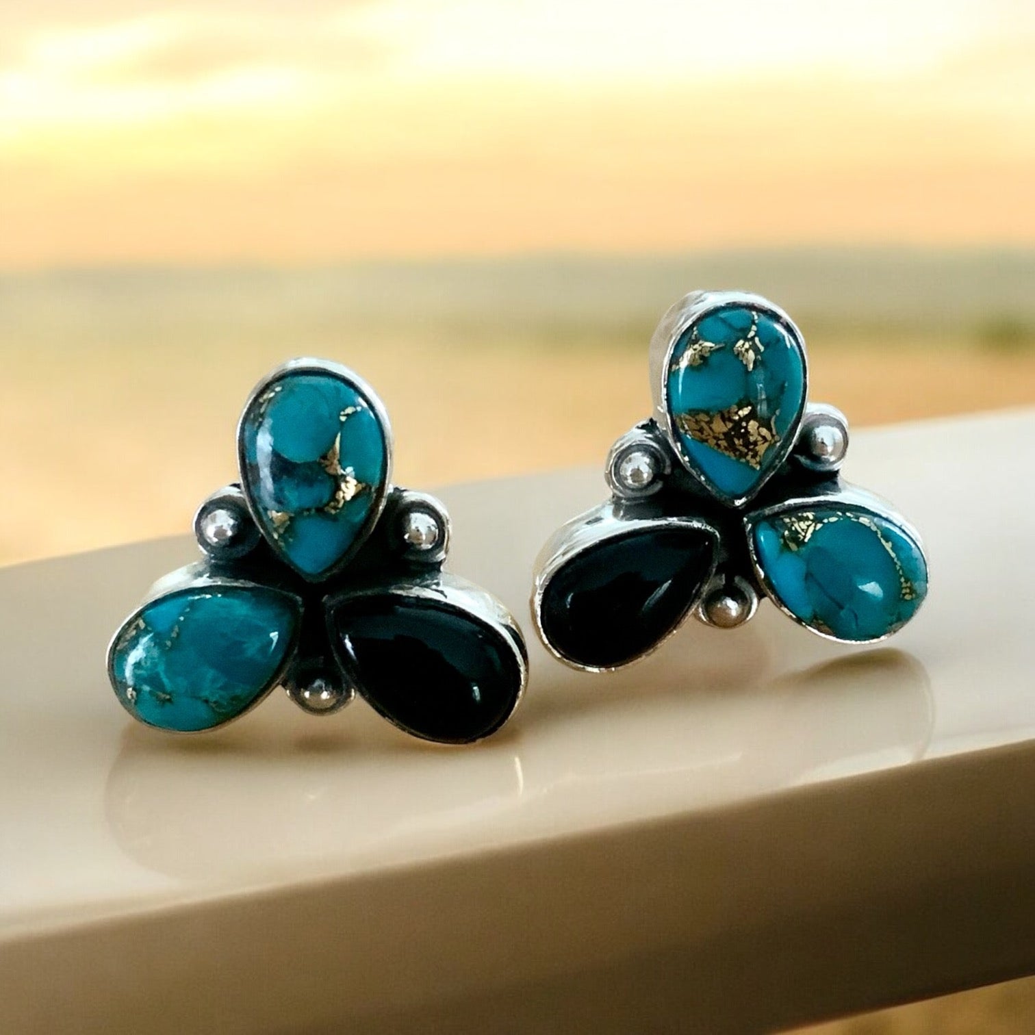 Kingman Blue Turquoise & Black Onyx Solid 925 Sterling Silver Earrings