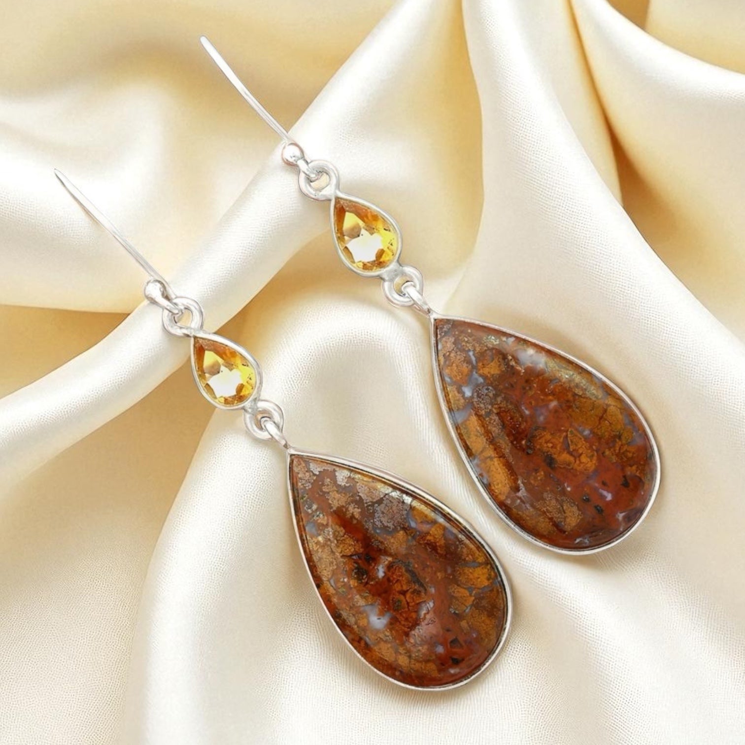 Red Moss Agate & Citrine Solid 925 Sterling Silver Earrings