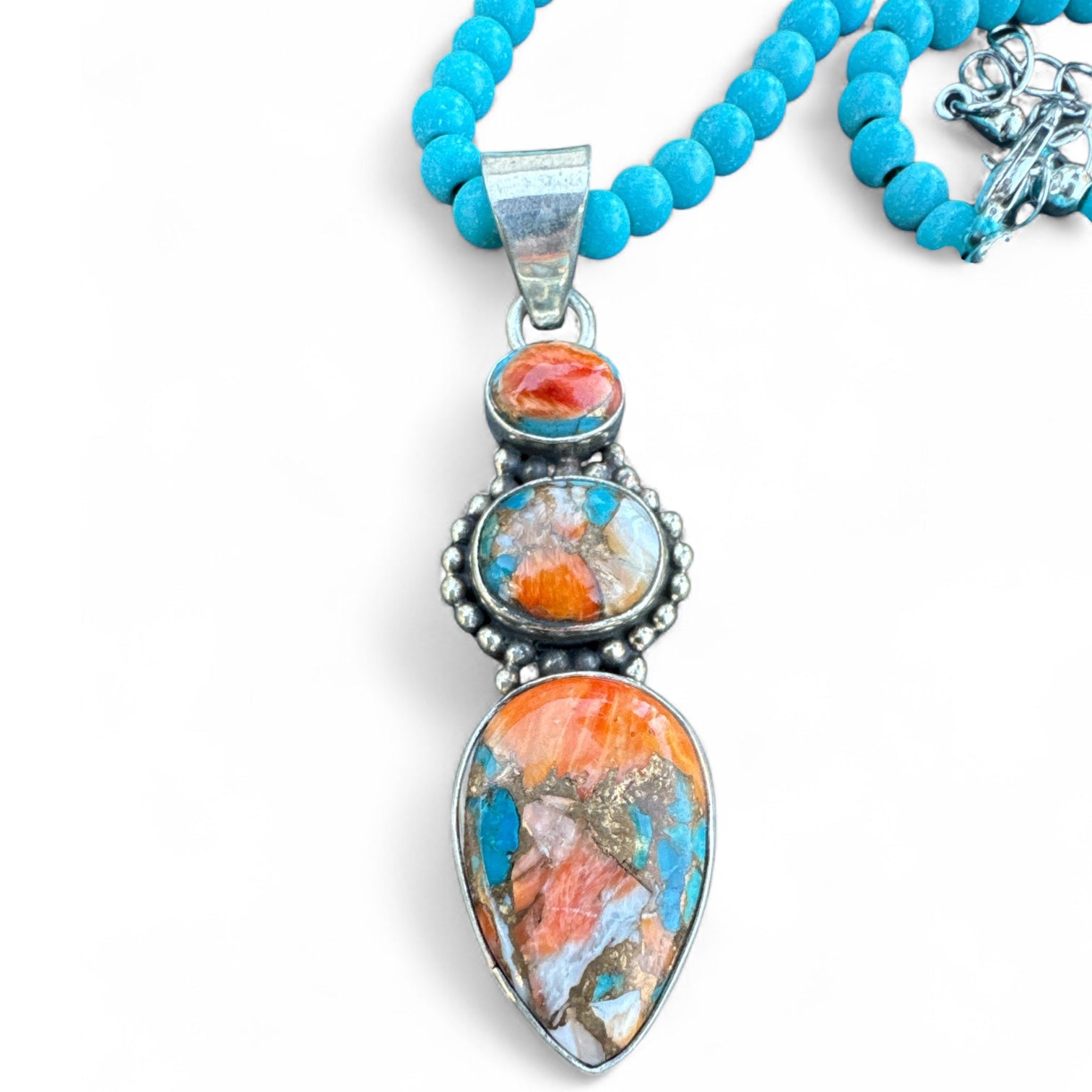 Kingman Turquoise & Spiny Oyster Solid 925 Sterling Silver Pendant Necklace