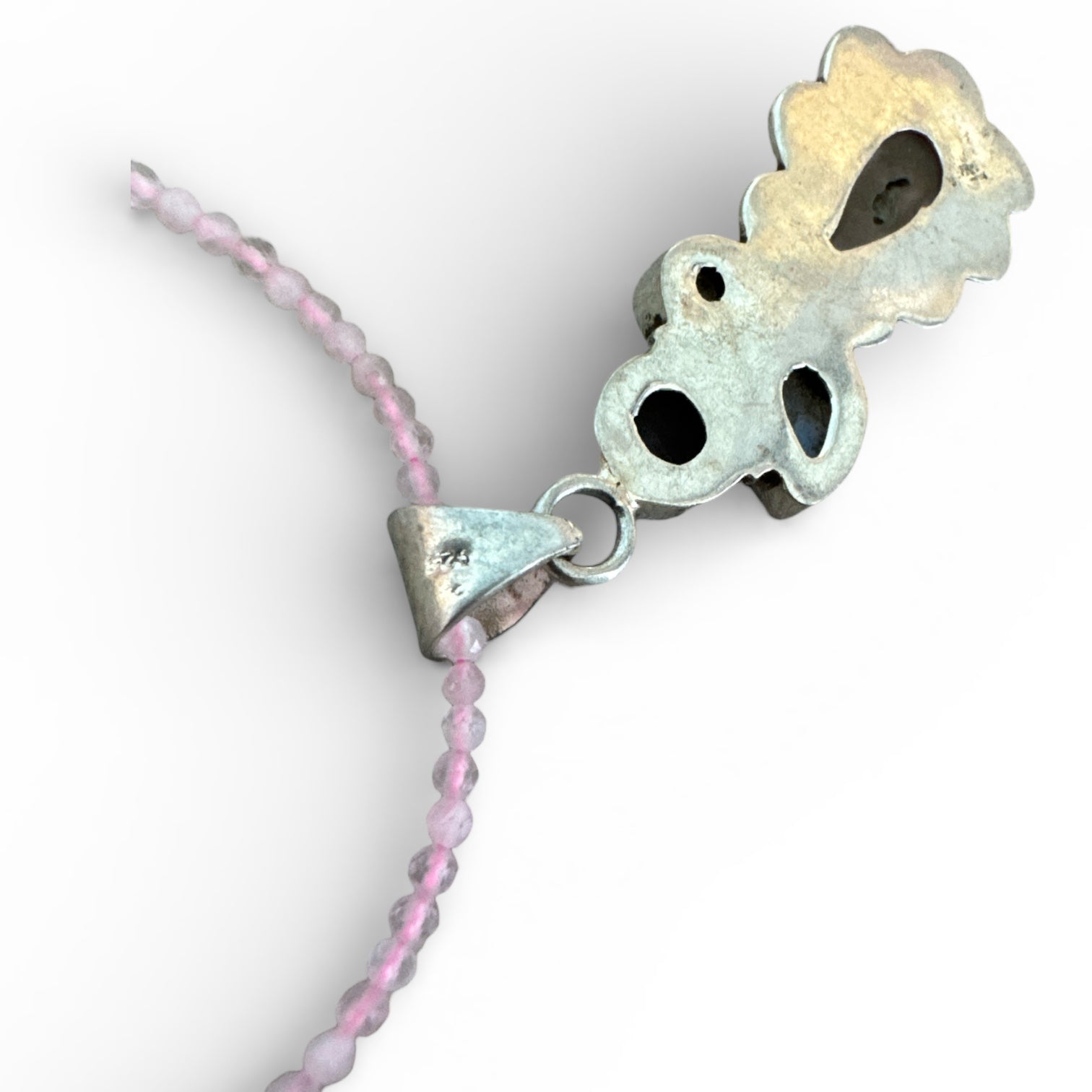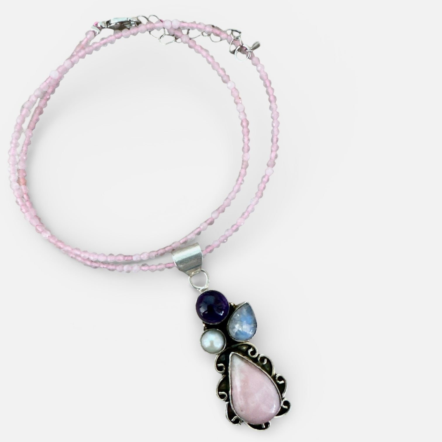 Pink Opal, Amethyst, Moonstone & Pearl Solid 925 Sterling Silver Pendant Necklace
