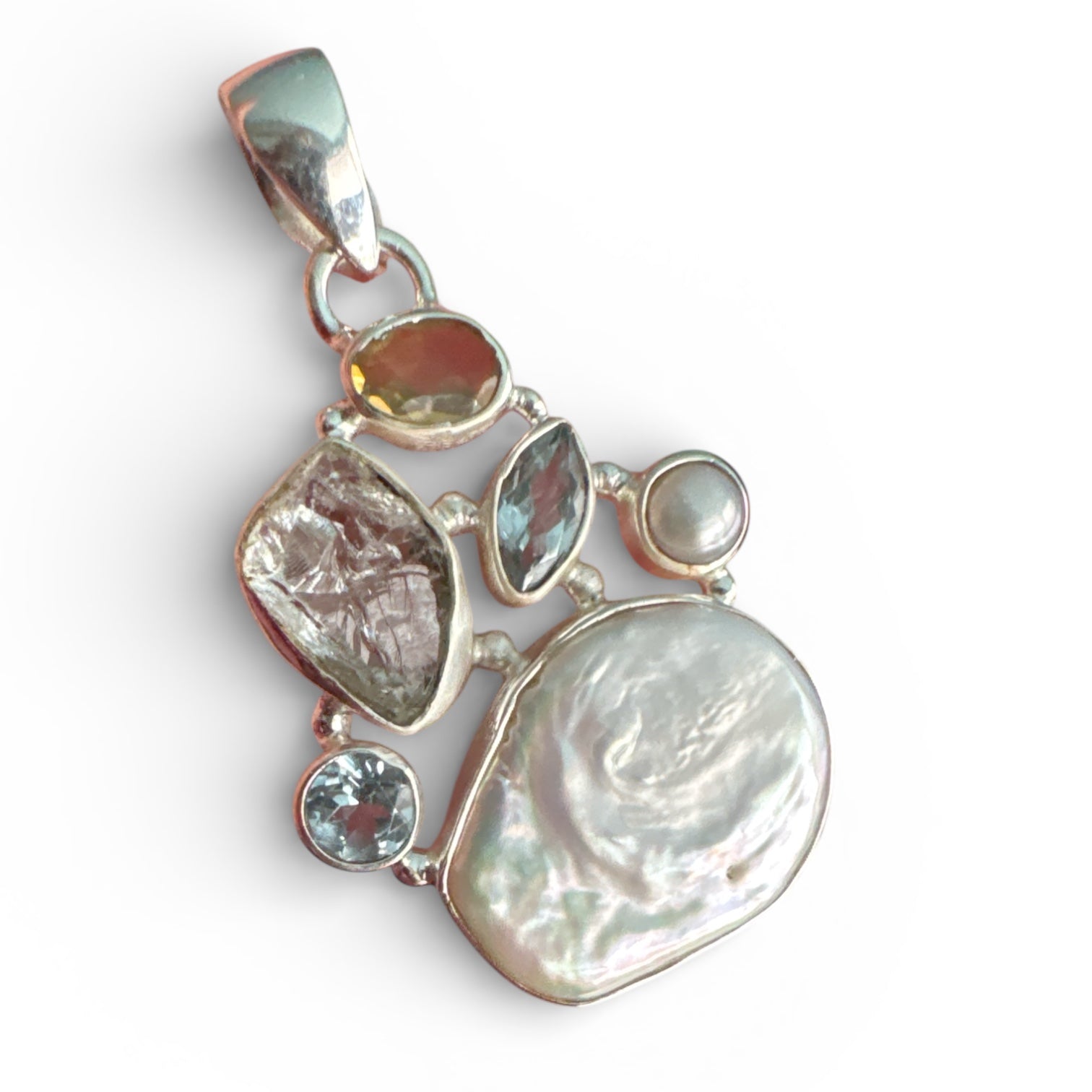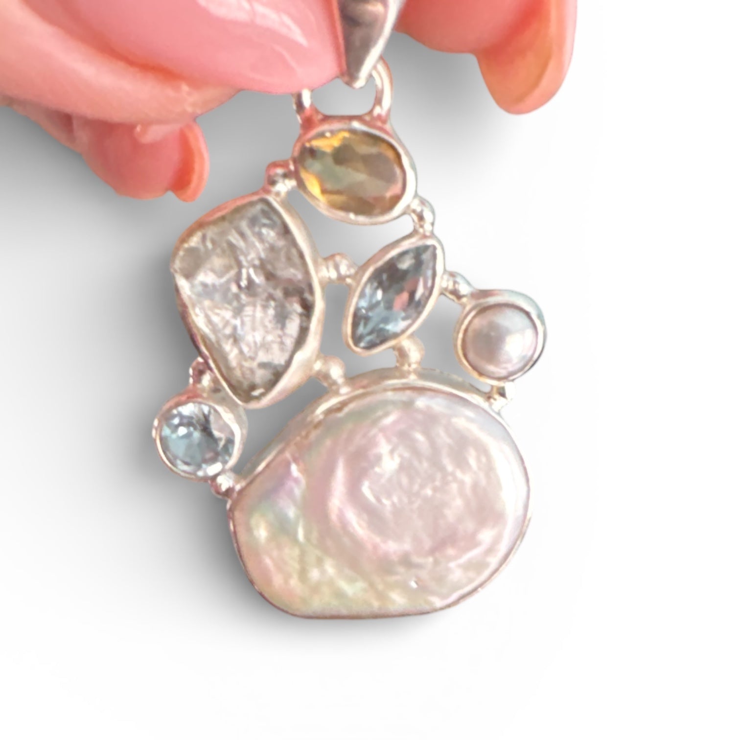 Baroque Pearl, Citrine, Herkimer Diamond & Blue Topaz Solid 925 Sterling Silver Pendant