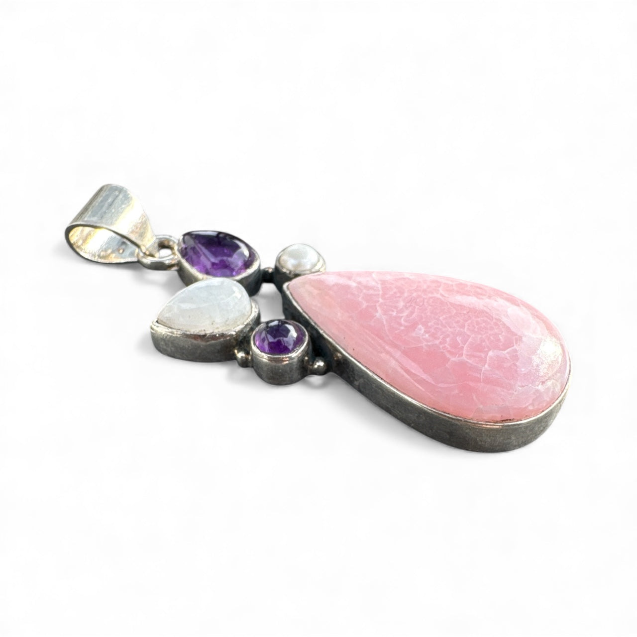 Pink Opal Amethyst Moonstone & Pearl Solid 925 Sterling Silver Pendant