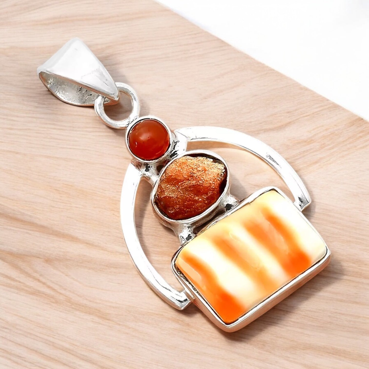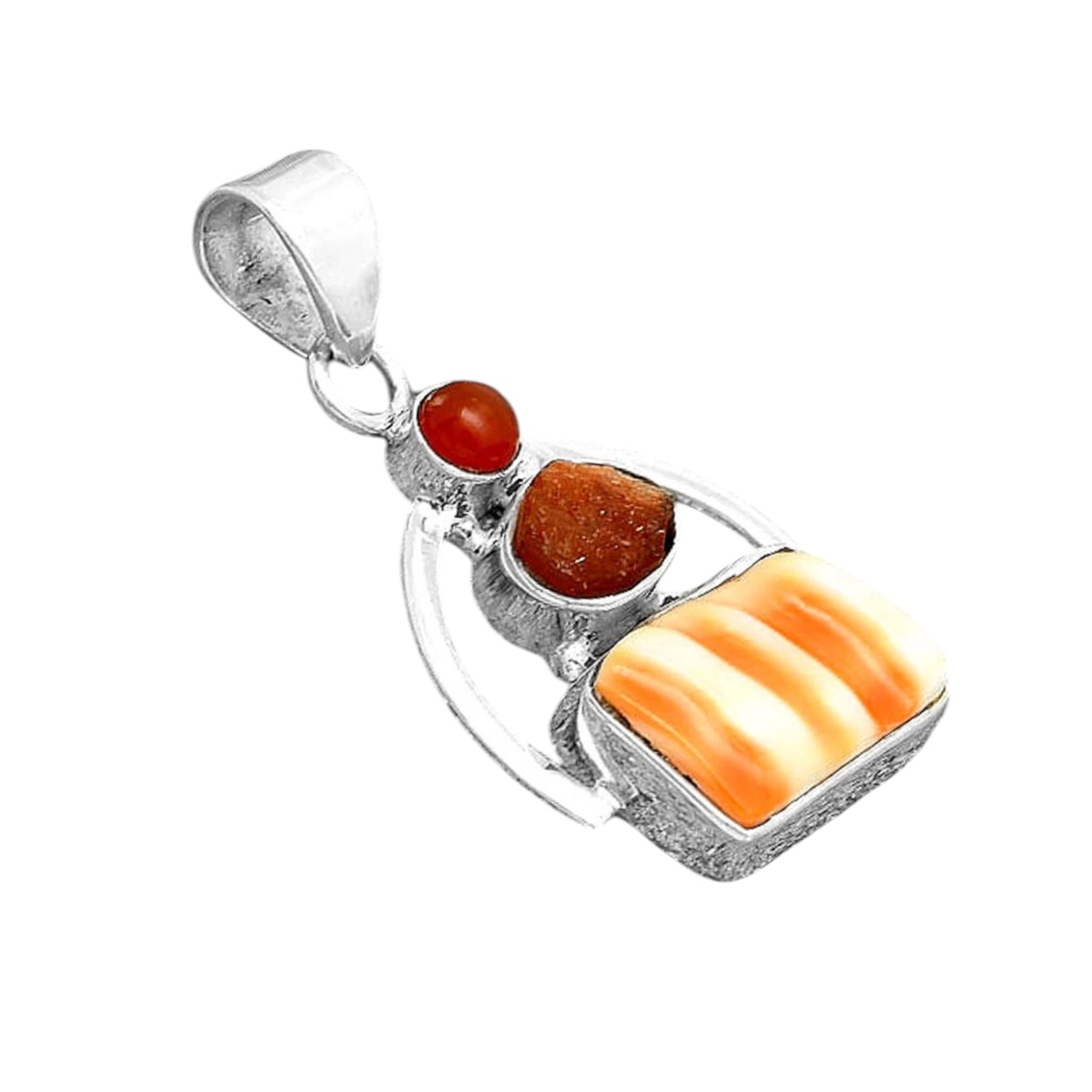 Spiny Oyster, rough Sunstone, Carnelian Solid 925 Sterling Silver Pendant