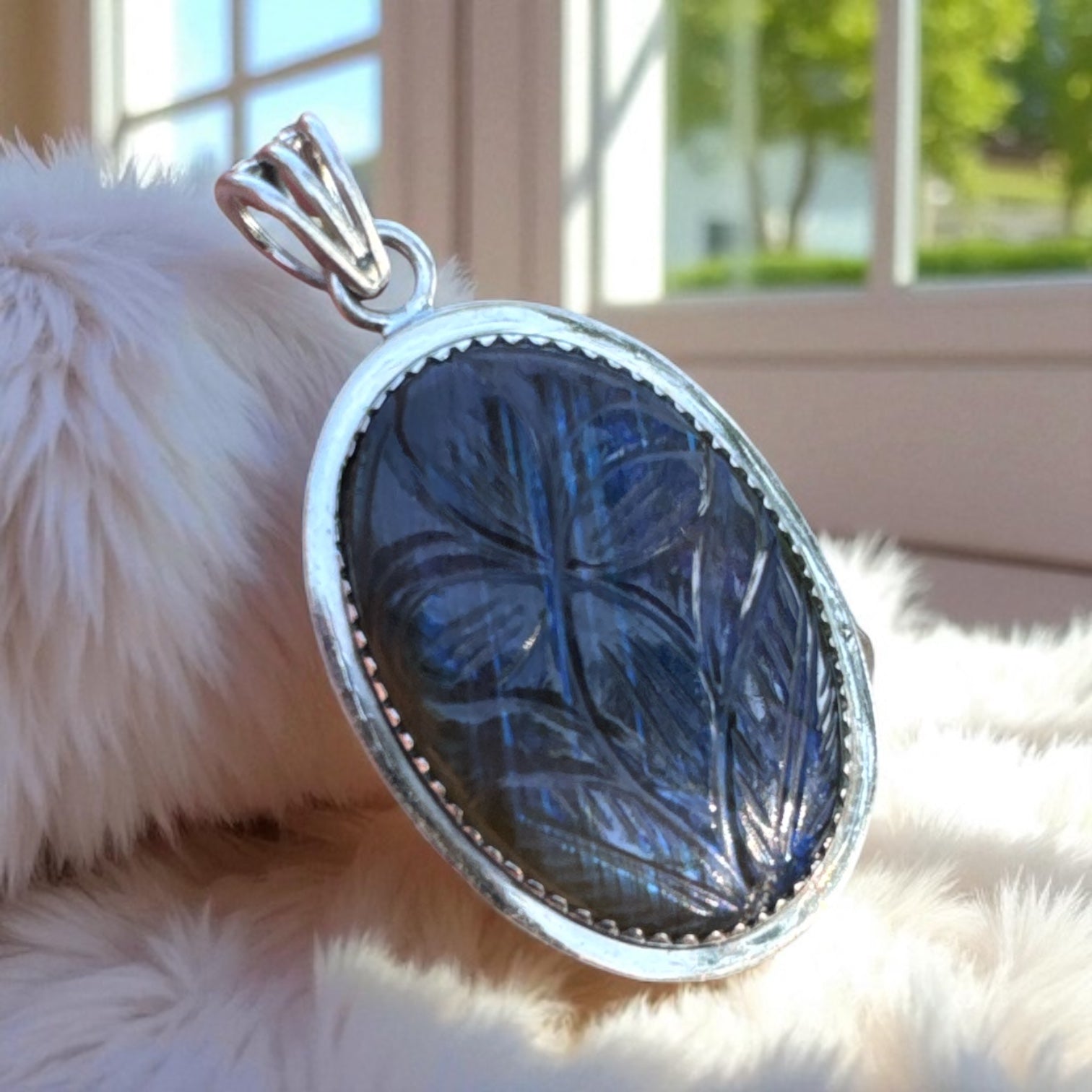 Carved Labradorite Solid 925 Sterling Silver Pendant