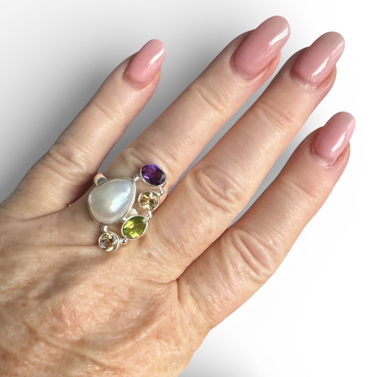 Baroque Pearl, Citrine, Amethyst & Peridot Solid 925 Sterling Silver Ring 8