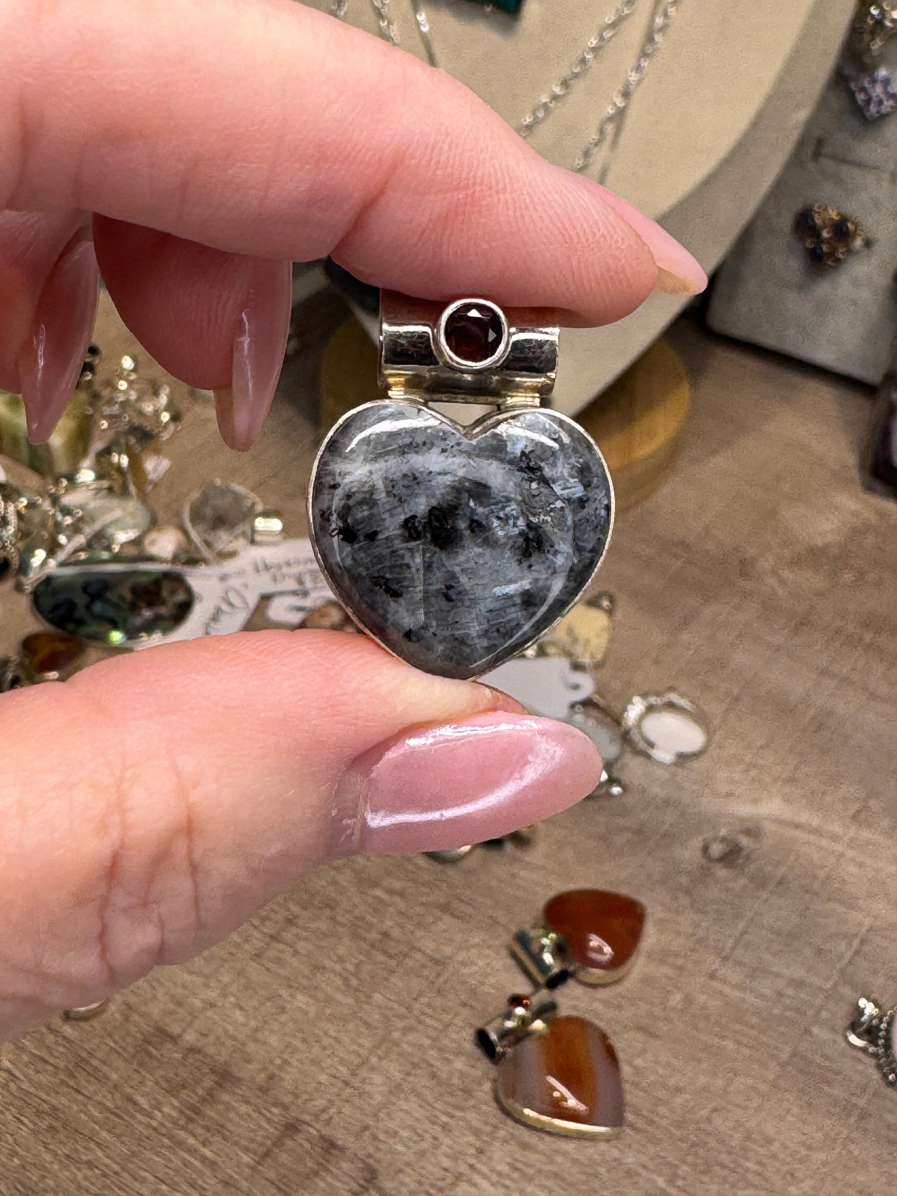 HEART Larvikite & Garnet & Solid 925 Sterling Silver Pendant