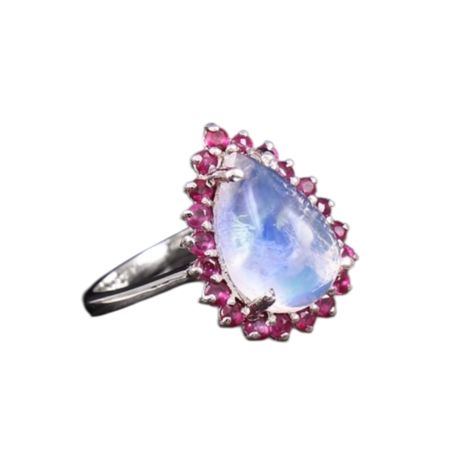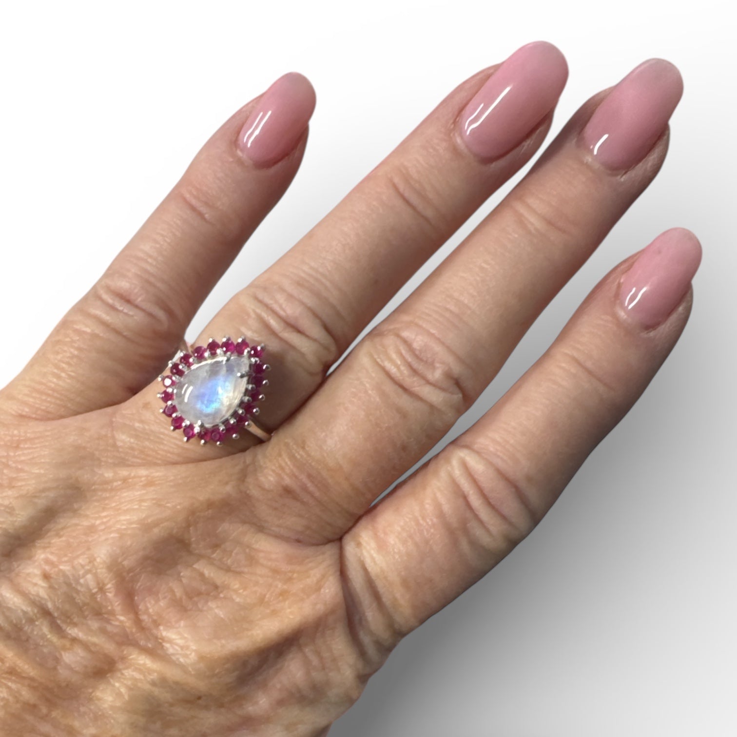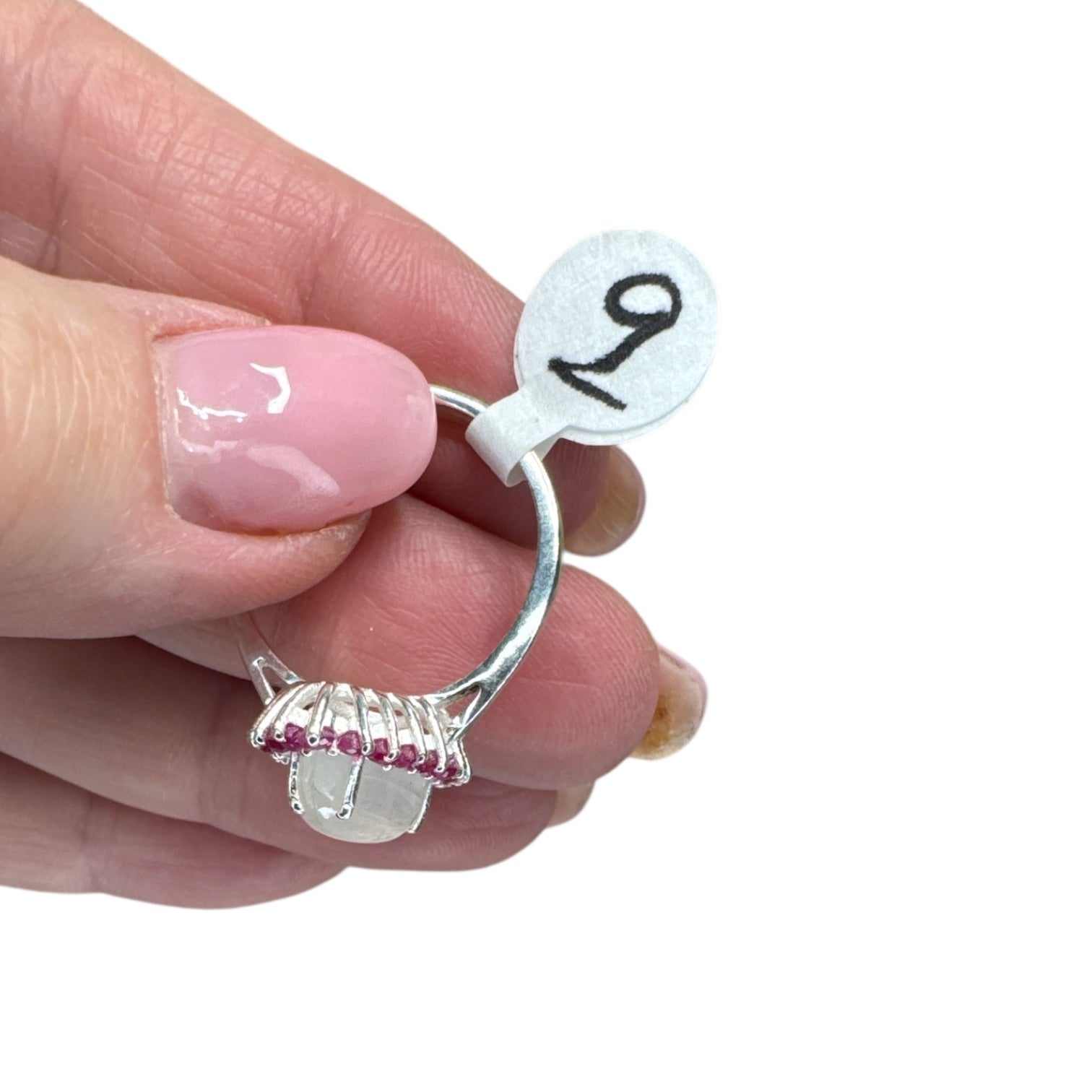 Rainbow Moonstone & Garnet Solid 925 Sterling Silver Ring 9